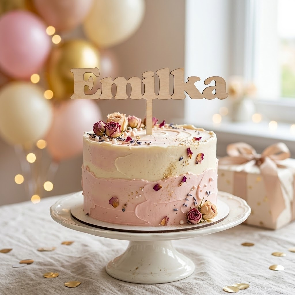 Zápich je lehký, ale pevný, a díky přírodnímu vzhledu skvěle doplní nejen dorty, ale i květinové dekorace či další cukrářské výtvory. Je to skvělý způsob, jak udělat z každého okamžiku nezapomenutelný zážitek a přidat jméno oslavence přímo do centra dění.
